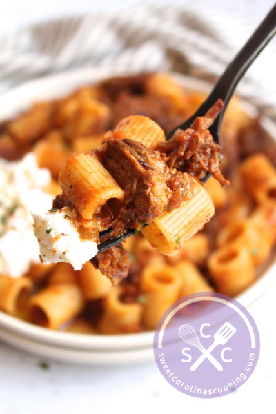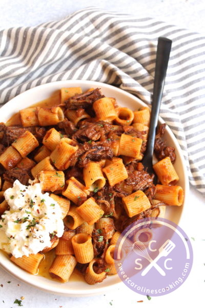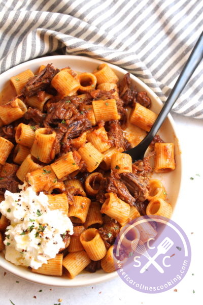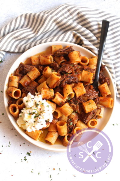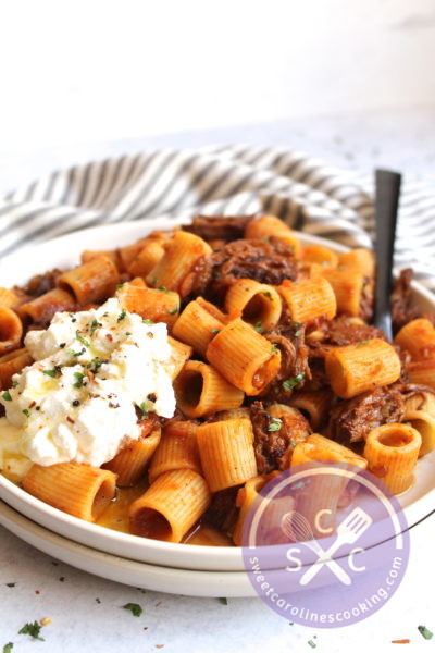 I know this isn’t the most ‘summer’ dish, but I would gladly eat it year-round. I mean, what’s not to love – fork-tender, 4-hour braised short rib, creamy ricotta drizzled with olive oil and a sprinkling of flaky sea salt and cracked black pepper…need I continue? This pasta dish is definitely hearty, but serve it alongside some salad and it balances out, right?!