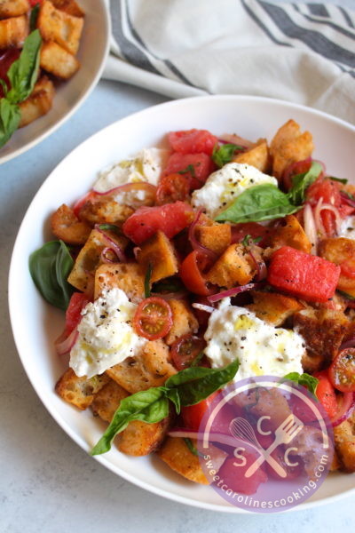 This dish just screams summer, am I right? Juicy watermelon, fresh basil, creamy burrata – all the good stuff. The panzanella is delicious on its own, but would be great as a side dish alongside grilled chicken, steak or fish.