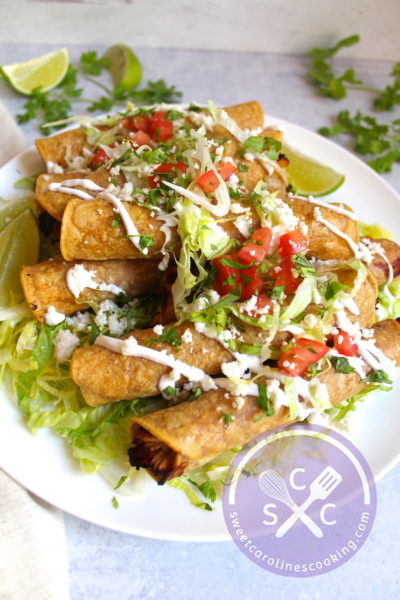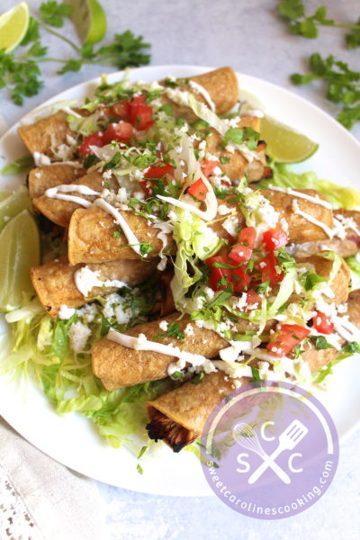 - Stack the taquitos on a platter, then garnish with sour cream, shredded lettuce, cotija cheese, diced tomatoes and chopped cilantro.