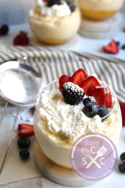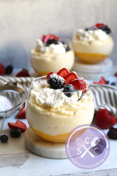 I’ve been on a big berry kick this summer…I just can’t get enough! I had some homemade lemon curd in the freezer from my mom that I’d been meaning to use, which is why this extremely easy dessert came to life. It’s layered with lemon curd, lemon mousse and homemade whipped ream (which I over-whipped and the perfectionist in me is cringing), then topped with fresh berries. So, so easy and delicious!