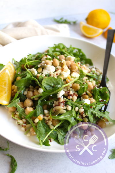 - In a large bowl, mix together the couscous, arugula, garbanzo beans and feta. Drizzle desired amount of lemon vinaigrette on top (you'll have leftover dressing), then gently toss together. Garnish with additional crumbled feta and lemon wedges, if desired, then serve. If you're serving more than two people, you'll want to double the recipe.