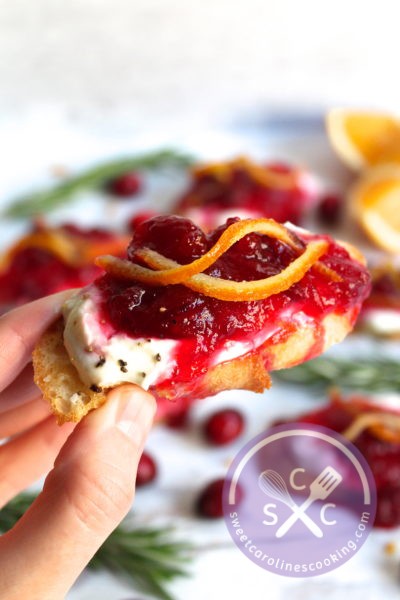 Not sure what to do with that leftover cranberry sauce? I highly recommend making these sweet and savory crostini. Even if you don’t have leftover cranberry sauce, you can make these as an appetizer then serve any of the leftover cranberry sauce as a side dish. Done and done! These crostini would be the perfect appetizer for Thanksgiving or any upcoming holiday gathering. They’re somewhat a labor of love because of the homemade candied orange zest, but trust me – it’s worth it. As an alternative, you could also buy store-bought candied orange zest and call it a day.