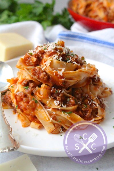 My husband and I took a cooking class in San Gimignano on our honeymoon a few years ago and still talk about the class to this day. All of the food we made was incredible, but the ragù was the standout dish. I’ve been making my slightly revised version of the ragù for years and it tastes just like I remember in Italy. The recipe has minimal ingredients, but is packed with flavor. I decided to make homemade fettuccine for this post, but by all means, use store-bought pasta if you’re in a pinch! Although I will say, the thin and silky smooth homemade noodles do make a difference in this dish and are worth making if you have the time.